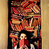 Description: a girl sitting in front of a packed bookshelf, shielding her face with an open book